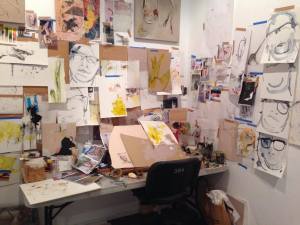 We have just pulled down and dissembled a large collection of artists’ bits and pieces belonging and precious to Carolyn V Watson, Sam Eyles and Jude Roberts. Organic ephemera indeed. These bits and pieces were the construction parts of the “temporary studio” in the main gallery space at Jugglers Art Space for 2 weeks for these three artists. While they worked away, we watched. We watched, enthralled at “the process.”